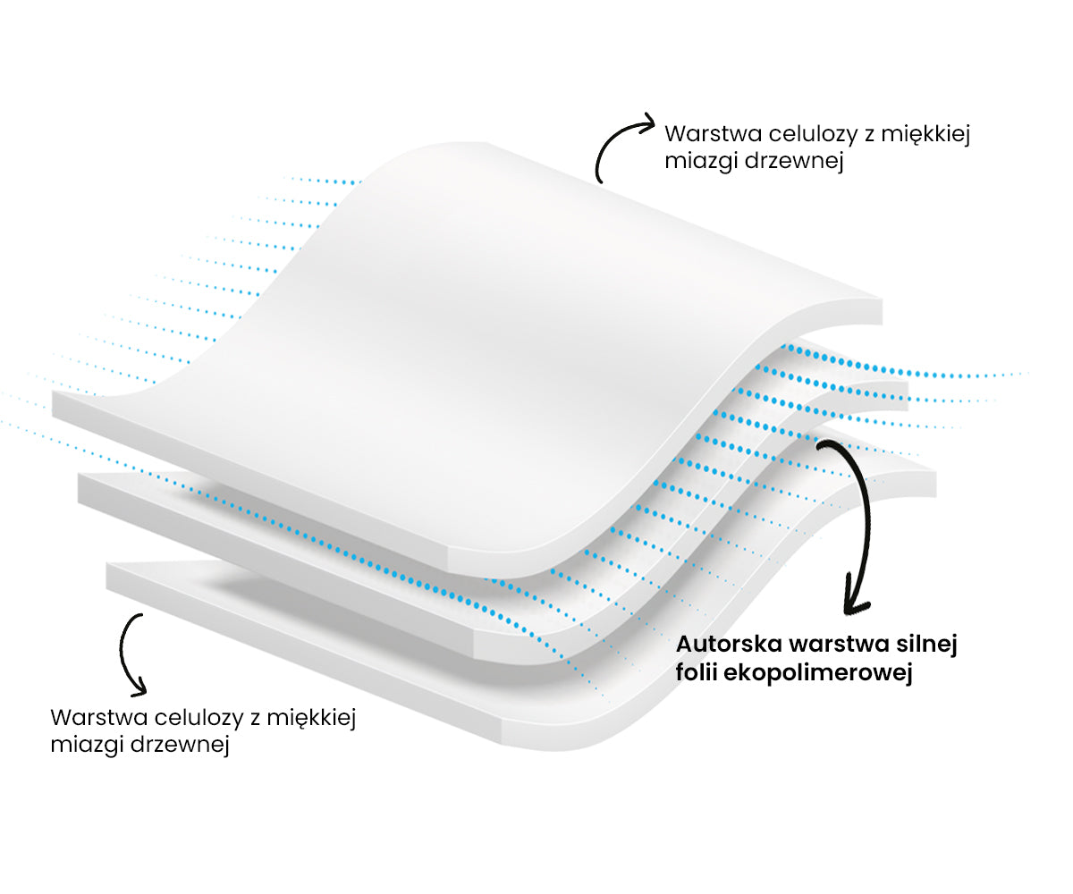 Wytrzymała warstwa folii między dwiema warstwami miękkiej miazgi drzewnej zapewnia nie tylko komfort, ale przede wszystkim skuteczną barierę przed bakteriami.